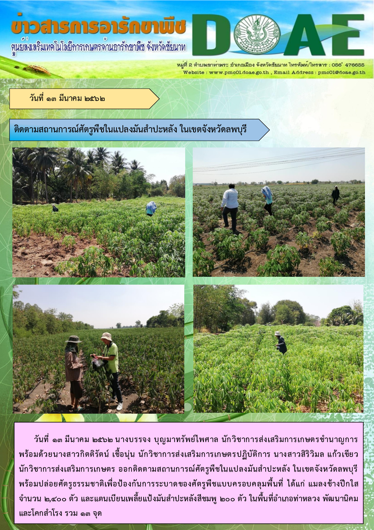 13-3-62 ติดตามสถานการณ์ศัตรูพืช ในแปลงมันสำปะหลัง ในเขตจังหวัดลพบุรี และปล่อยแมลงศัตรูธรรมชาติ