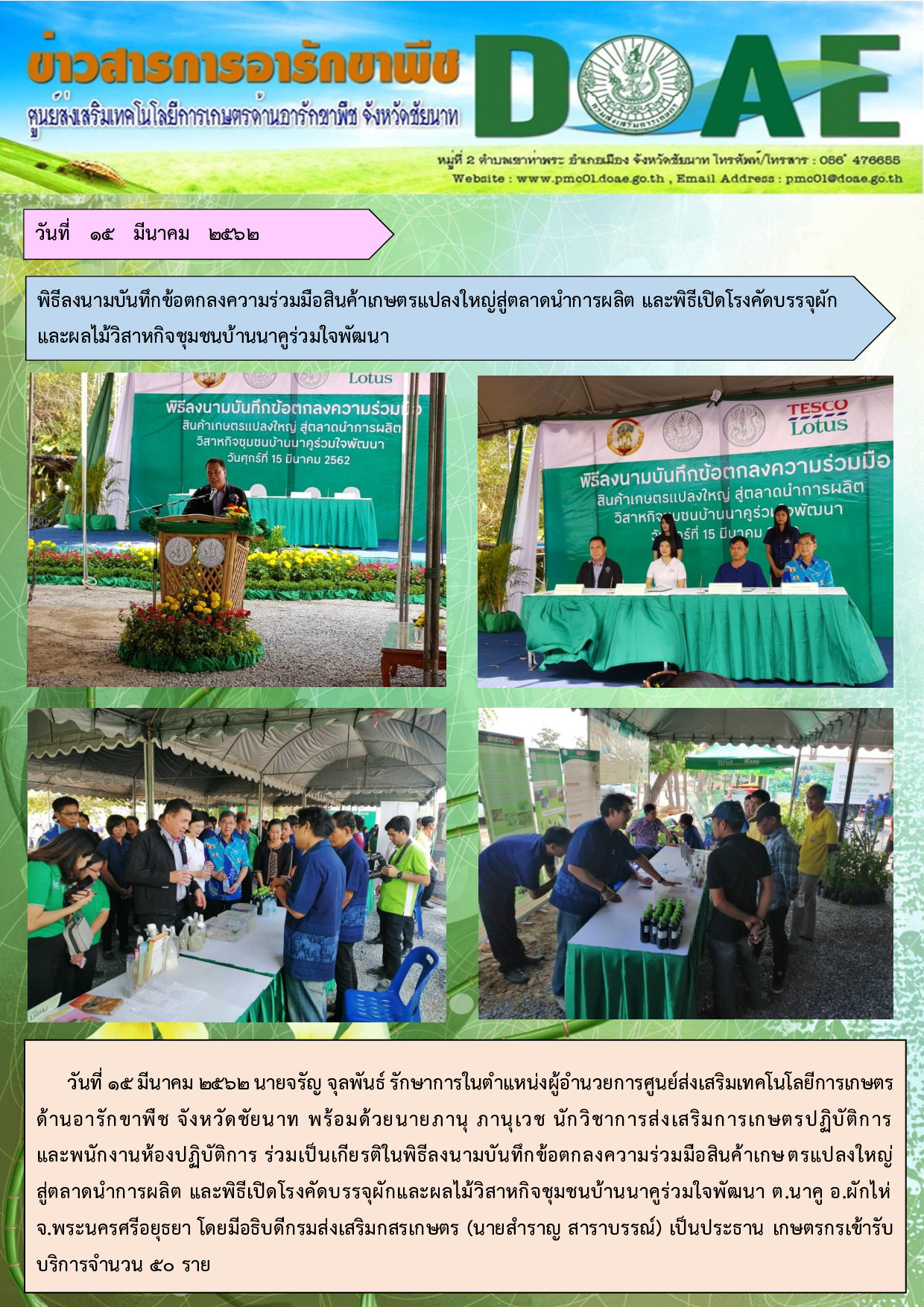 15-3-62 พิธีลงนามบันทึกข้อตกลงความร่วมมือ สินค้าเกษตรแปลงใหญ่สู่ตลาดนำการผลิตและพิธีเปิด โรงคัดบรรจุผักและผลไม้วิสาหกิจชุมชนบ้านนาคูร่วมใจพัฒนา