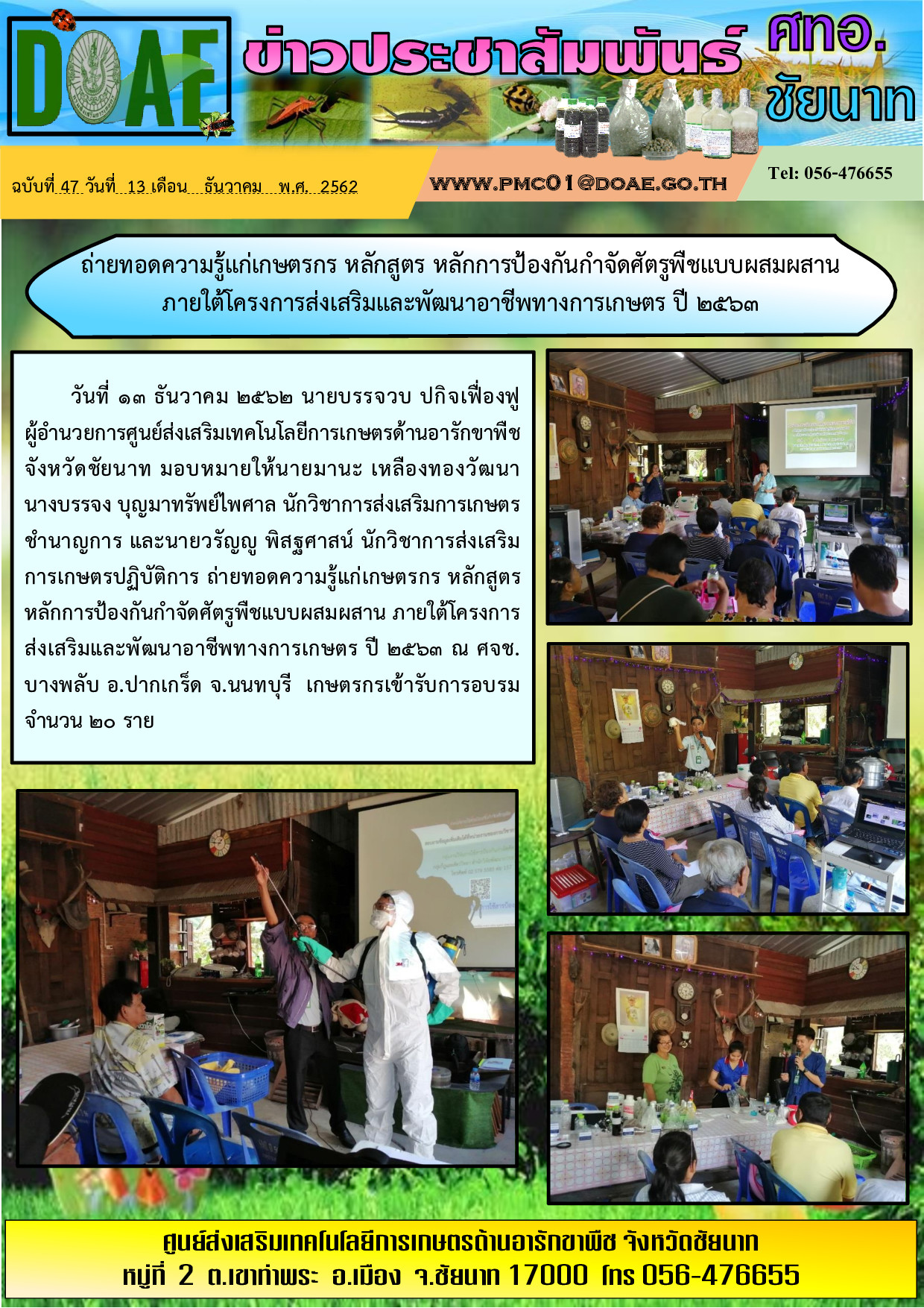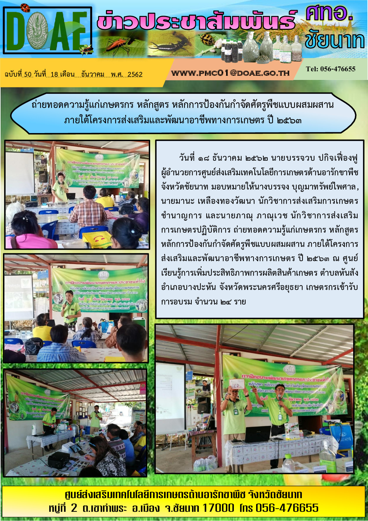 18-12-62 ถ่ายทอดความรู้แก่เกษตรกร หลักสูตร หลักการป้องกันกำจัดศัตรูพืชแบบผสมผสาน ภายใต้โครงการส่งเสริมและพัฒนาอาชีพ ทางการเกษตร ปี 2563 จังหวัดพระนครศรีอยุธยา