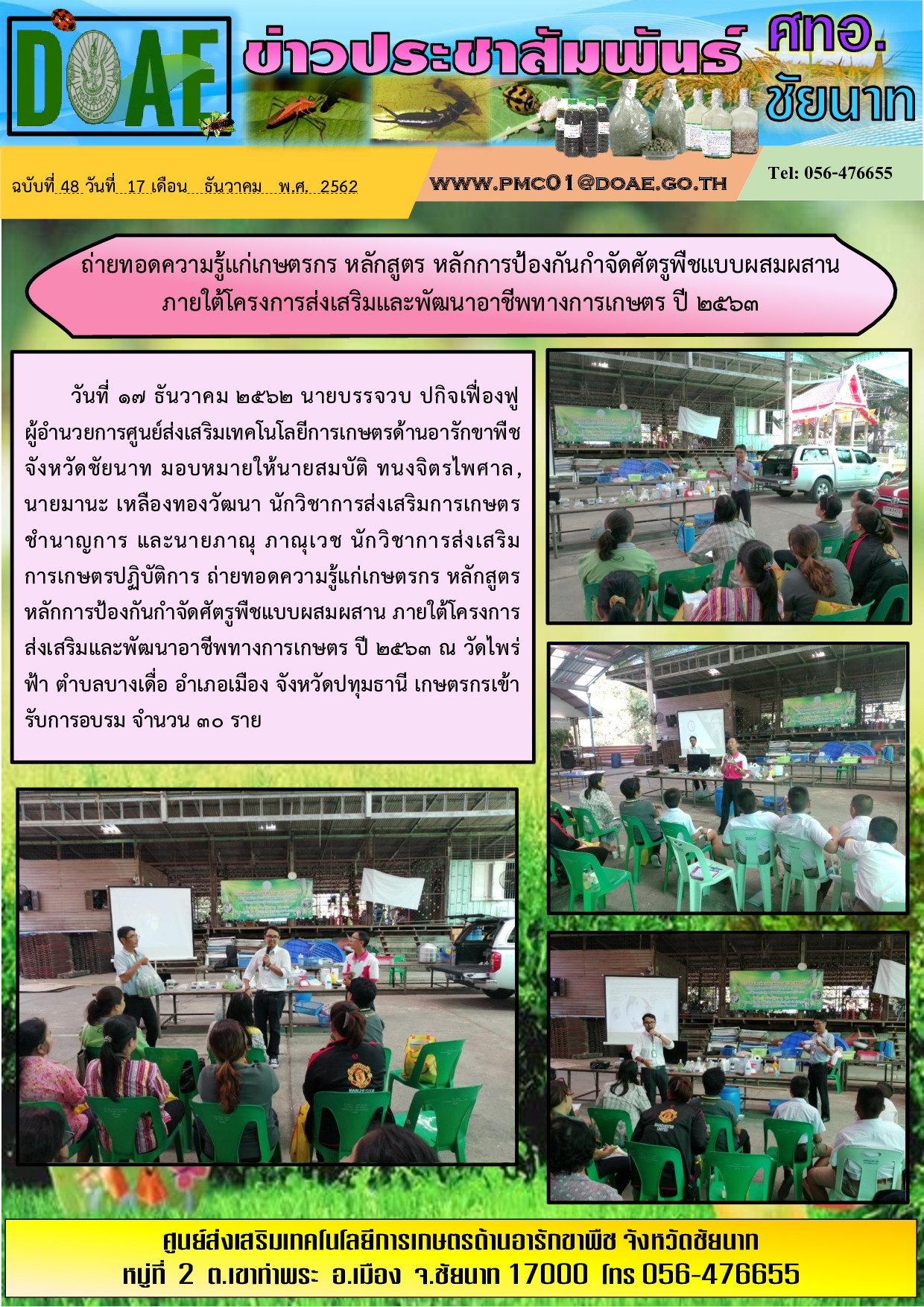 17-12-62 ถ่ายทอดความรู้แก่เกษตรกร หลักสูตร หลักการป้องกันกำจัดศัตรูพืชแบบผสมผสาน ภายใต้โครงการส่งเสริมและพัฒนาอาชีพ ทางการเกษตร ปี 2563 จังหวัดปทุมธานี