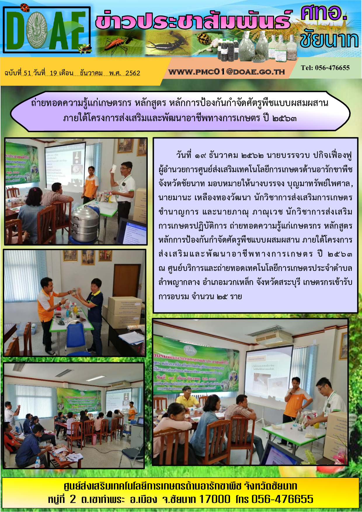 19-12-62 ถ่ายทอดความรู้แก่เกษตรกร หลักสูตร หลักการป้องกันกำจัดศัตรูพืชแบบผสมผสาน ภายใต้โครงการส่งเสริมและพัฒนาอาชีพ ทางการเกษตร ปี 2563 จังหวัดสระบุรี