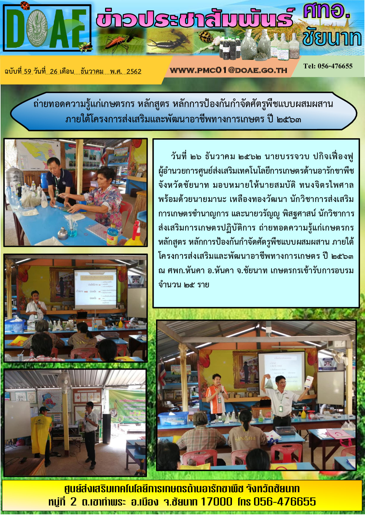 26-12-62 ถ่ายทอดความรู้แก่เกษตรกร หลักสูตร หลักการป้องกันกำจัดศัตรูพืชแบบผสมผสาน ภายใต้โครงการส่งเสริมและพัฒนาอาชีพ ทางการเกษตร ปี 2563